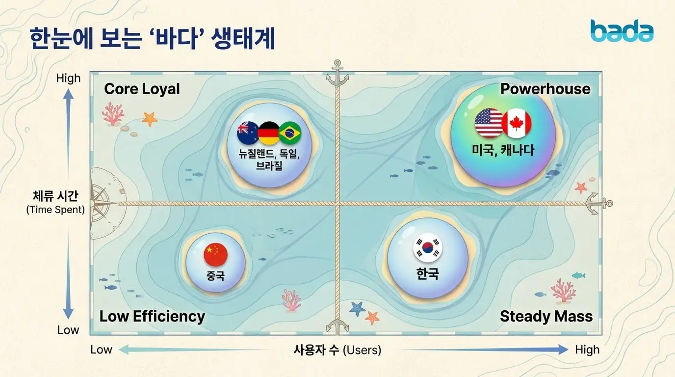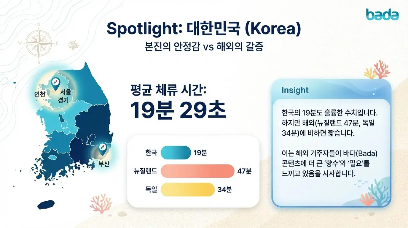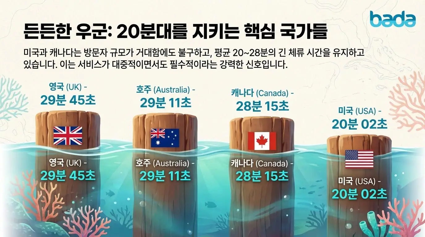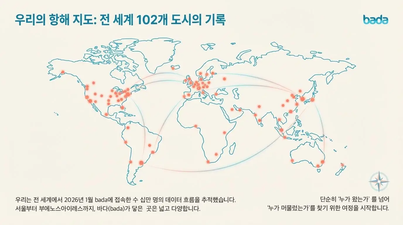 위는 저희 바다에 2026년 1월 동안 10분이상 체류하신 분들의 "국가별 도시별 사용자 몰입도 및 평균 체류 시간 보고서"입니다.