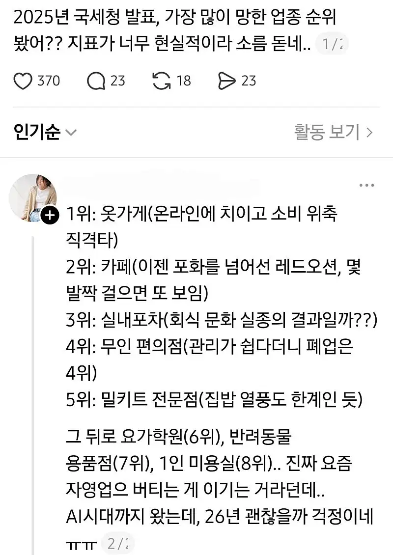 0 1 [세계엔] 2025년 국세청이 밝힌 최악의 자영업 실패 사례 #이슈 #비즈니스 #한국 Posted on 15 hours 17 minutes ago 3,042 views by anonymous 출처 : 신고 해외 최대 해외 거주 한인 네트워크 바다에 광고하시면 대박납니다! 광고문의 관련게시물 [유머] 인기태그 사랑의(1750) 온도(1536) 당신이(638) 블랙(597) 20세기(589) 마녀의(534) 미운(513) 고백부부(448) 잠든(437) 동상이몽(423) 해외 최대 해외 거주 한인 네트워크 바다에 광고하시면 대박납니다! 광고문의 사진추가 댓글입력 추천하기 more