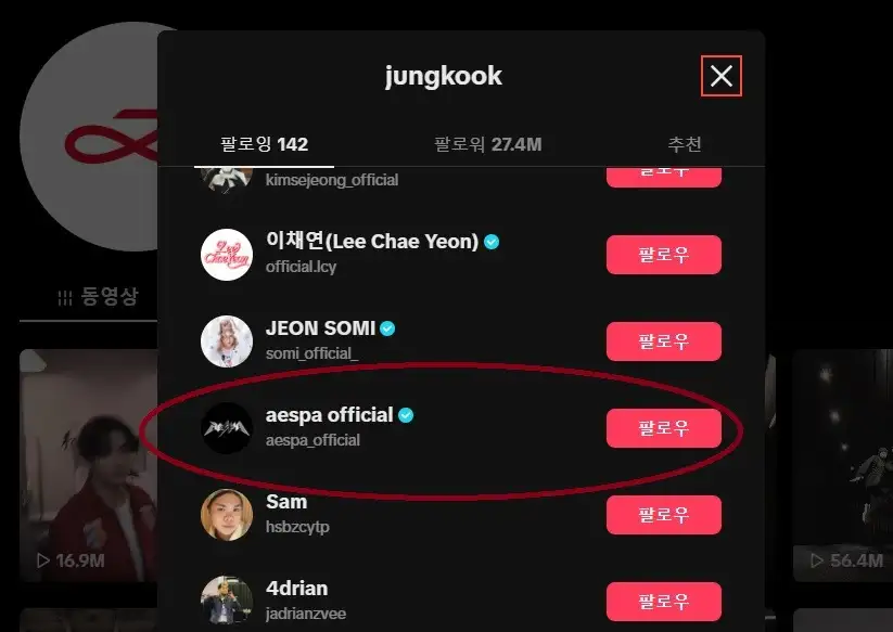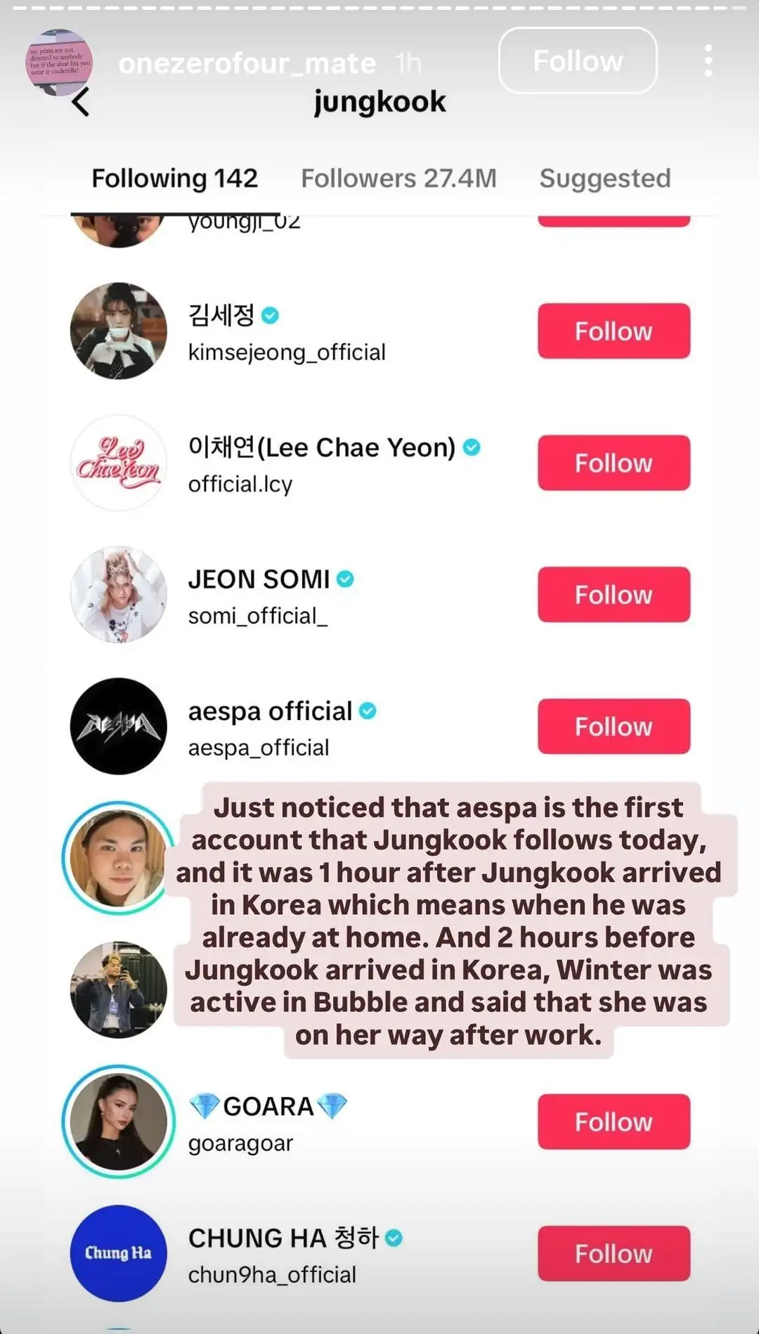 오늘 정국이가 제일 먼저 팔로우한 계정이 에스파라는 걸 방금 알았어. 정국이가 한국에 도착하고 1시간 뒤였으니까 이미 집에 도착했을 때지. 그리고 정국이가 도착하기 2시간 전에 윈터가 버블에 퇴근하고 가는 중이라고 글을 올렸었어.