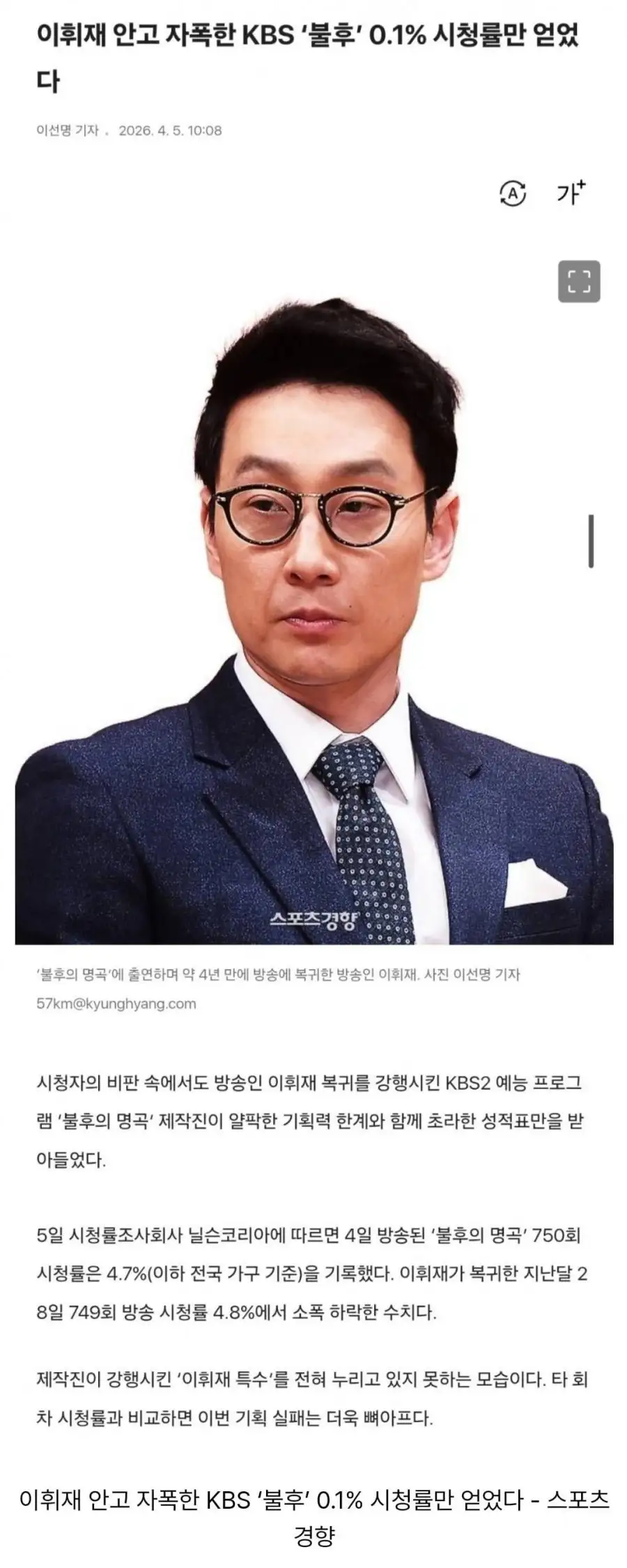 1 1 [세계엔] 이휘재 안고 자폭한 KBS `불후` 0.1% 시청률만 얻었다 ㄷㄷ.jpg https://m.entertain.naver.com/home/article/144/0001107838 조만간 프로그램 폐지 수순으로 ㅋㅋㅋ https://www.ppomppu.co.kr/zboard/view.php?id=freeboard&no=9898846 #유머 Posted on 8 hours 26 minutes ago 435 views by anonymous 출처 : 신고 해외 최대 해외 거주 한인 네트워크 바다에 광고하시면 대박납니다! 광고문의 관련게시물 [유머] 인기태그 사랑의(1750) 온도(1536) 당신이(638) 블랙(597) 20세기(589) 마녀의(534) 미운(513) 고백부부(448) 잠든(437) 동상이몽(423) 해외 최대 해외 거주 한인 네트워크 바다에 광고하시면 대박납니다! 광고문의 사진추가 댓글입력 추천하기 more